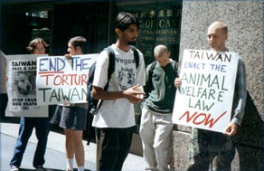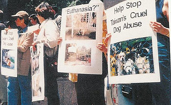 In Taiwan there are still close to two million abandoned dogs living this hellish life every day. With sick and weak bodies, they are fighting extreme cold or heat, thirst and hunger. These innocent creatures are trying their very best to survive on busy streets, running away from kicking feet and constantly trying to avoid capture by unreleasible wires. Asians for Humans, Animals & Nature instigated the first protest at the San Francisco Taipei Economic & Culture Center. Then using our strategy, IDA & Peta cooperated and assistance, with our united effort, after the second worldwide protest, Taiwan finally passed the animal protection law.